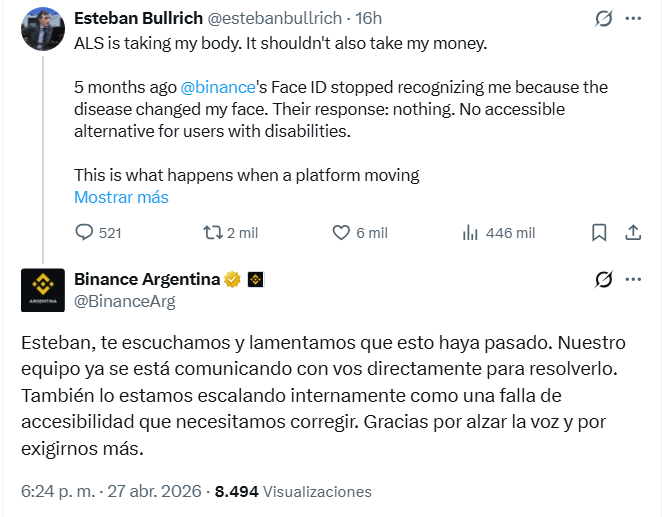 Bullrich sostuvo que intentó resolver el problema con la compañía, pero aseguró que no obtuvo respuestas efectivas durante meses. En su publicación, también apuntó contra la empresa por considerar que trata la accesibilidad “como algo opcional”, y etiquetó a directivos de Binance para visibilizar el reclamo.