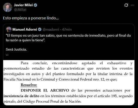 Javier Milei también se hizo eco de la noticia: expresó en X que “esto se empieza a poner lindo”.