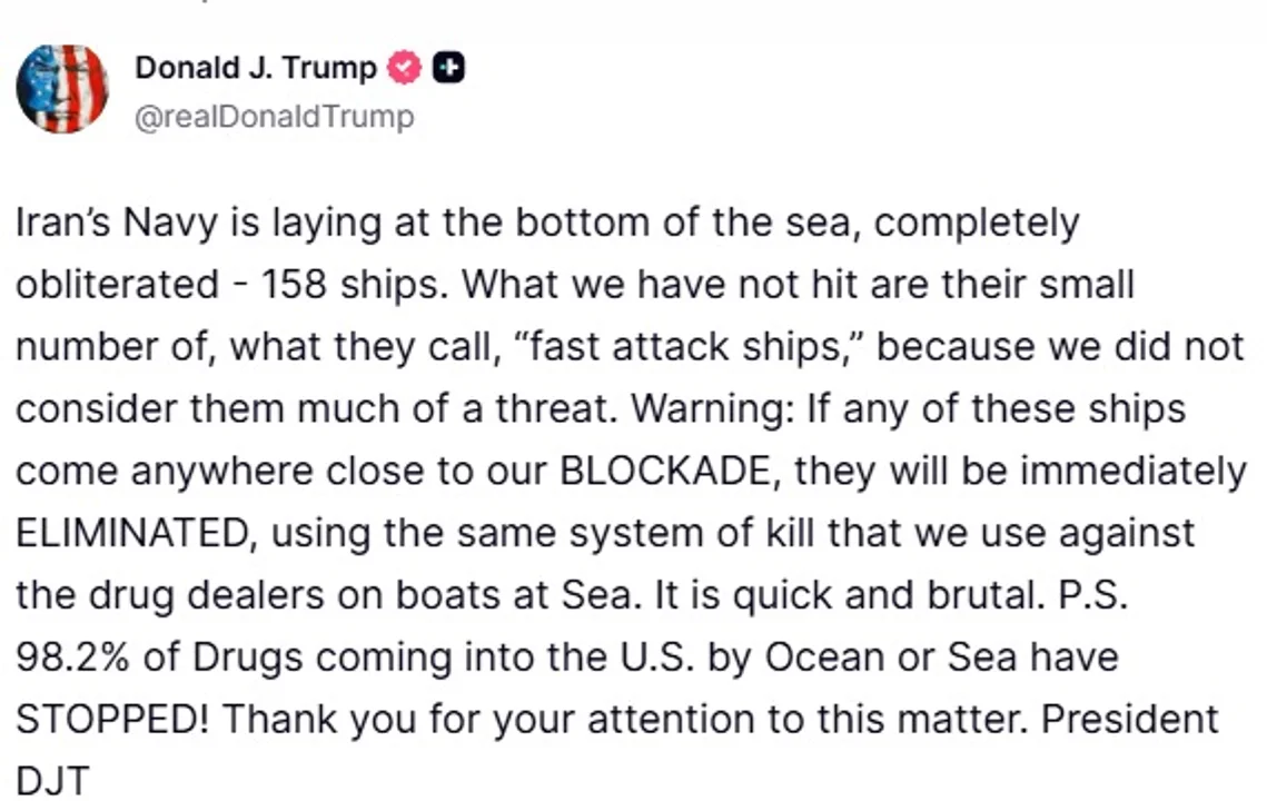 “La Armada iraní yace en el fondo del mar, completamente destruida: 158 buques. No hemos atacado su pequeño número de lo que ellos llaman ‘buques de ataque rápido’, porque no los considerábamos una gran amenaza”, señaló Trump.