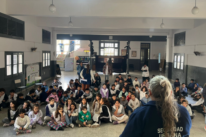 La actividad estuvo destinada a alumnos de primer y segundo ciclo, quienes fueron organizados en dos grupos de aproximadamente 100 estudiantes cada uno. La capacitación fue brindada por el equipo del área de Seguridad Ciudadana, que inició el encuentro con una presentación sobre su rol en la vía pública y la importancia del cumplimiento de las normas y señales de tránsito.
