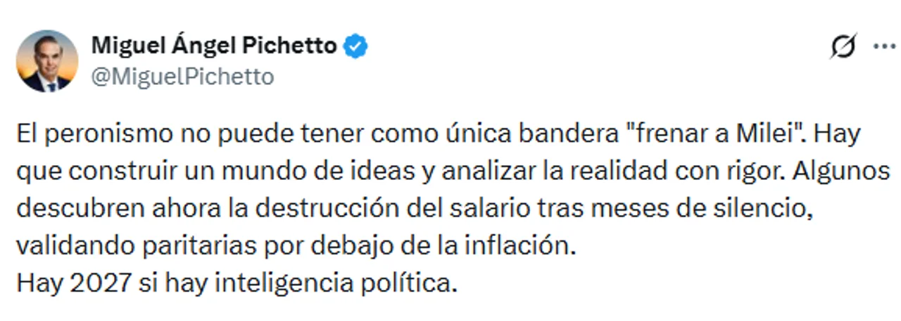 "El peronismo no puede tener como única bandera "frenar a Milei". Hay que construir un mundo de ideas y analizar la realidad con rigor. Algunos descubren ahora la destrucción del salario tras meses de silencio, validando paritarias por debajo de la inflación. Hay 2027 si hay inteligencia política", manifestó desde sus redes sociales.
