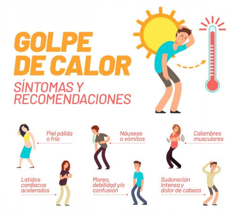 En estas situaciones el cuerpo tiene dificultades para regular su temperatura y pueden aparecer síntomas tales como como fiebre alta, cambios en el estado mental o el comportamiento (confusión, agitación, dificultad en el habla), piel seca o sudoración excesiva, náuseas y vómitos, piel enrojecida, pulso acelerado, respiración agitada, dolor de cabeza, agotamiento, cansancio o debilidad, sed intensa y sequedad en la boca, sensación de calor sofocante, mareos o desmayos.