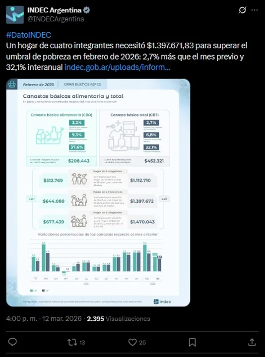 “Un hogar de cuatro integrantes necesitó $1.397.671,83 para superar el umbral de pobreza en febrero de 2026: 2,7% más que el mes previo y 32,1% interanual”, tal como indica el INDEC en su informe de datos al respecto de la canasta básica para el mes de febrero de 2026.
