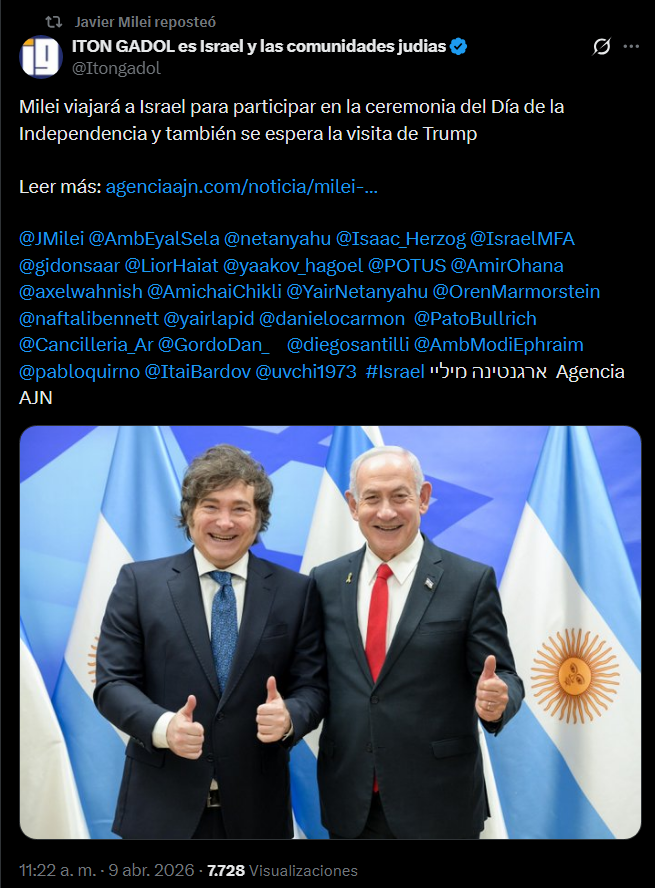 La noticia fue informada por la AJN (Agencia Judía de Noticias) y retuiteada por el mandatario en su cuenta de X.