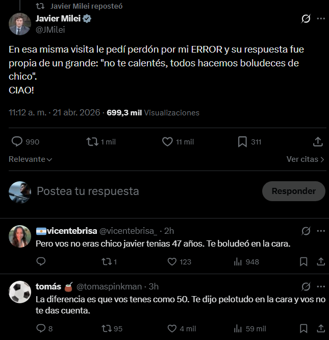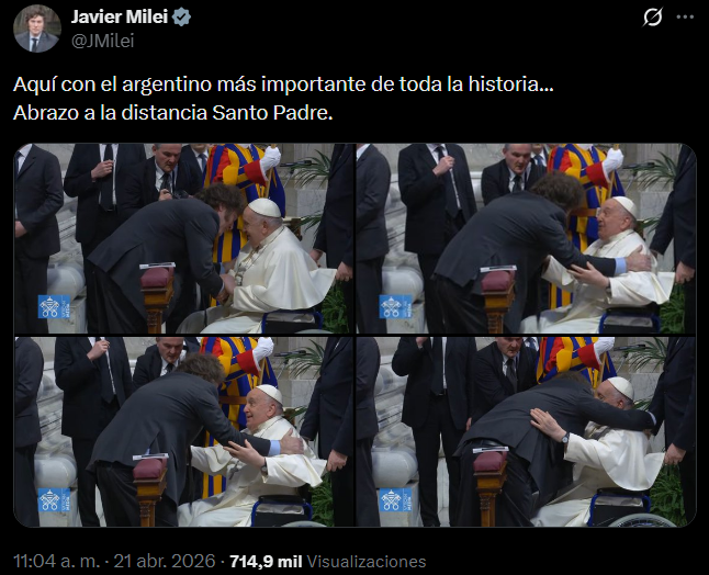 “En esa misma visita le pedí perdón por mi ERROR y su respuesta fue propia de un grande: "No te calentés, todos hacemos boludeces de chico". CIAO!", escribió Milei en su cuenta oficial de X, conmemorando el primer aniversario de la muerte del sumo pontífice.