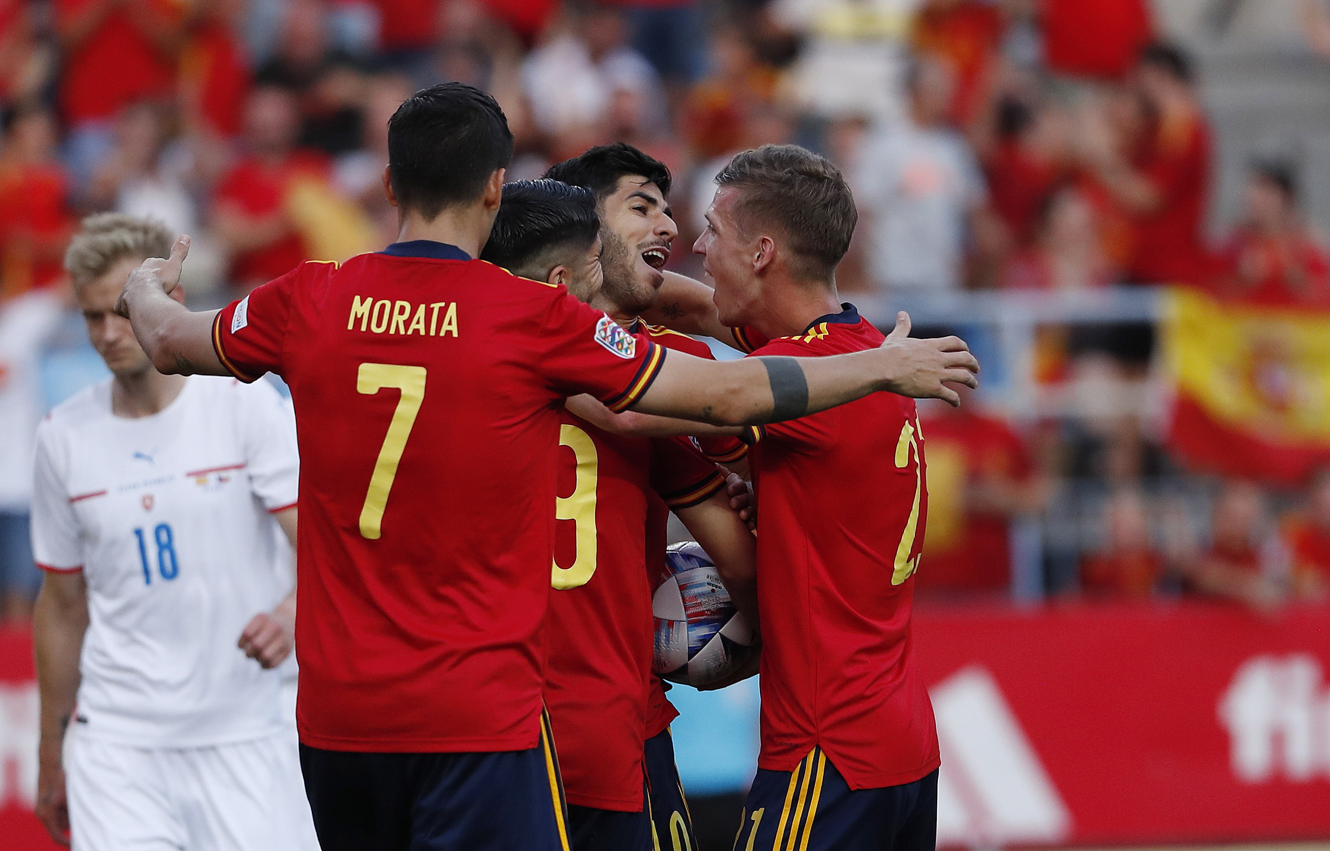 El asedio y dominio de España fue abrumador desde el vamos, con una línea ofensiva de tres —con Olmo y Torres por los costados, más Asensio por el medio.