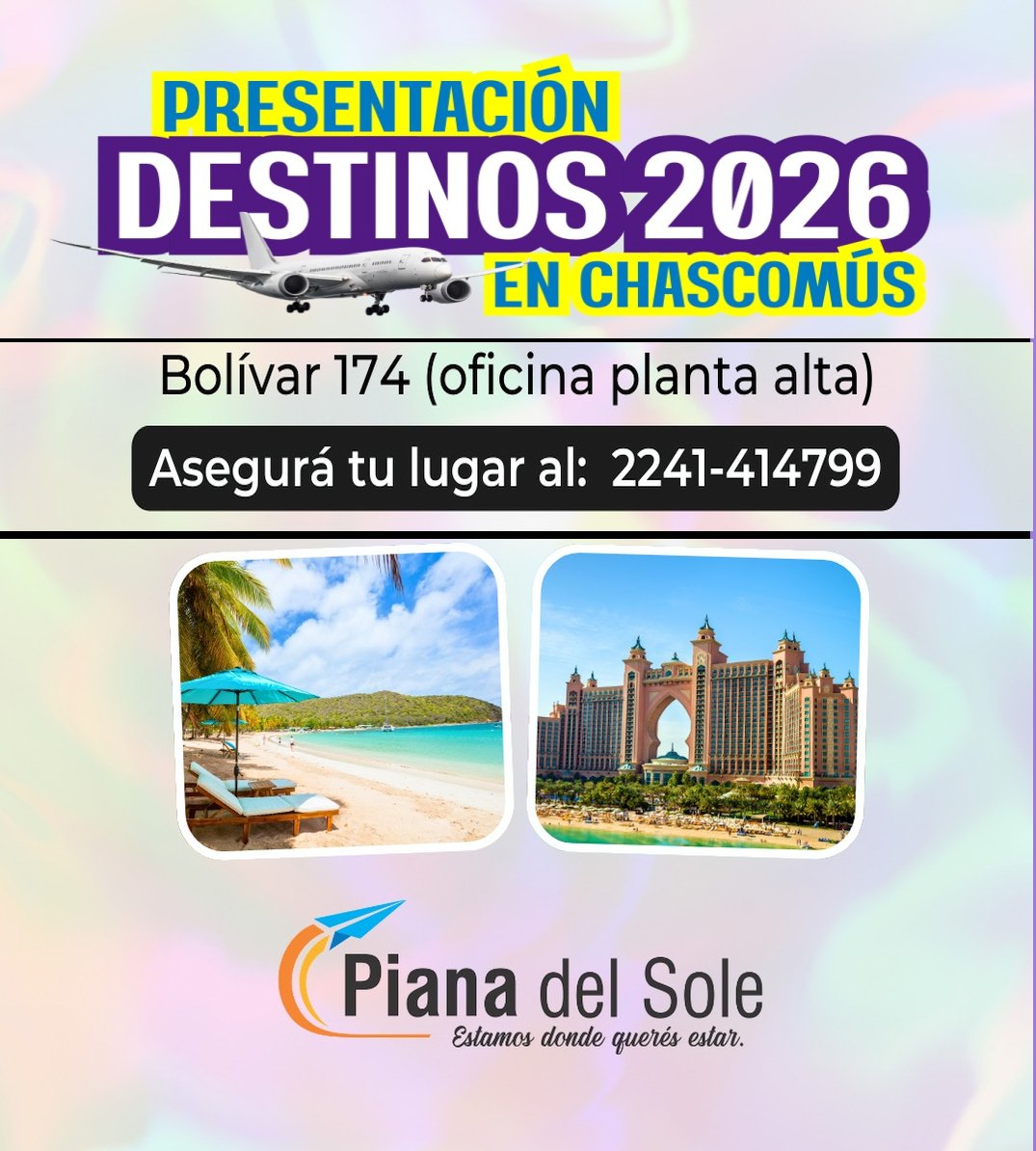 La agencia de viajes Piana del Sole realizó en Chascomús la presentación oficial de sus destinos para la temporada 2026, en un encuentro que reunió a vecinos interesados en conocer las nuevas propuestas turísticas.