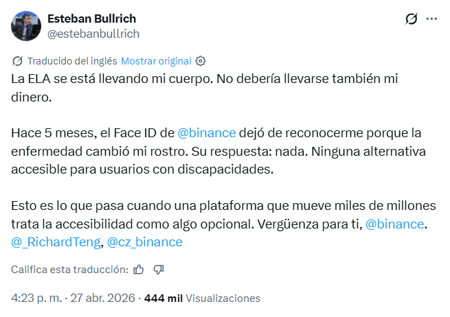 Bullrich sostuvo que intentó resolver el problema con la compañía, pero aseguró que no obtuvo respuestas efectivas durante meses. En su publicación, también apuntó contra la empresa por considerar que trata la accesibilidad “como algo opcional”, y etiquetó a directivos de Binance para visibilizar el reclamo.