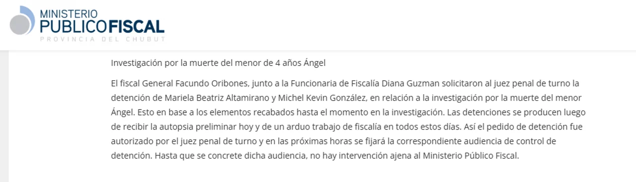 “Las detenciones se producen luego de recibir la autopsia preliminar hoy y de un arduo trabajo de fiscalía en todos estos días. Así el pedido de detención fue autorizado por el juez penal de turno y en las próximas horas se fijará la correspondiente audiencia de control de detención. Hasta que se concrete dicha audiencia, no hay intervención ajena al Ministerio Público Fiscal”, confirmó el organismo chubutense.