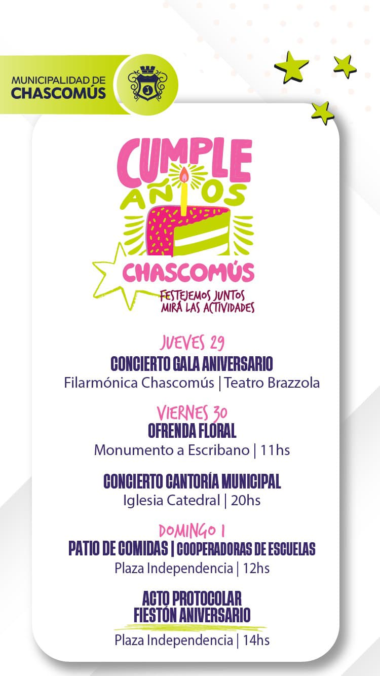 A continuación, se brinda la programación de las distintas propuestas que rendirán homenaje a nuestra ciudad, en un fin de semana signado por el 246° aniversario de la fundación de Chascomús.