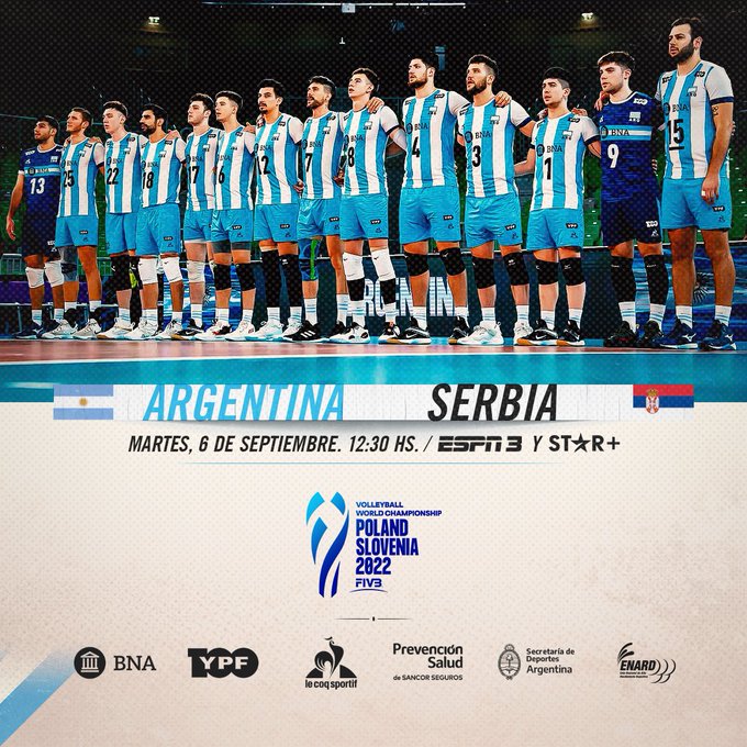 La Selección de vóleibol de la Argentina se medirá con Serbia, uno de los mejores de la primera fase, en busca de la clasificación para los cuartos de final del Mundial de Vóley de Polonia y Eslovenia. El partido se jugará a partir de las 12:30 en el estadio Arena Gliwice de la ciudad homónima polaca y será televisado por ESPN y Star+.